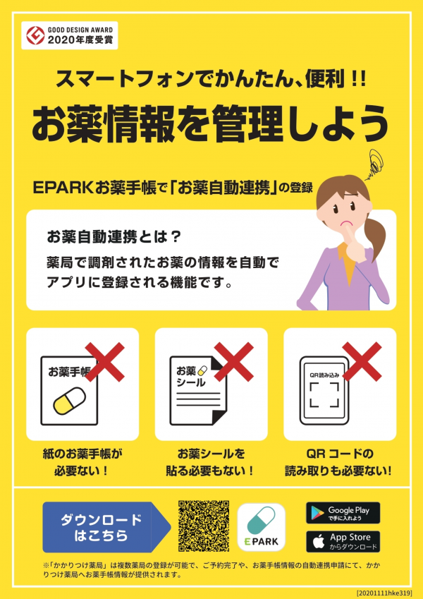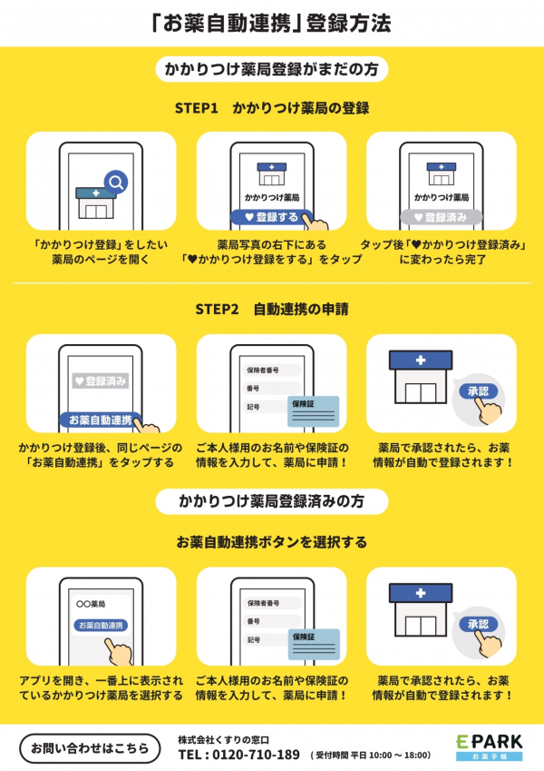 スマートフォンにEPARKお薬手帳をインストールして、忘れずに「お薬自動連携」を登録しましょう。これで、手帳を忘れても服薬履歴が自動的に更新されます!